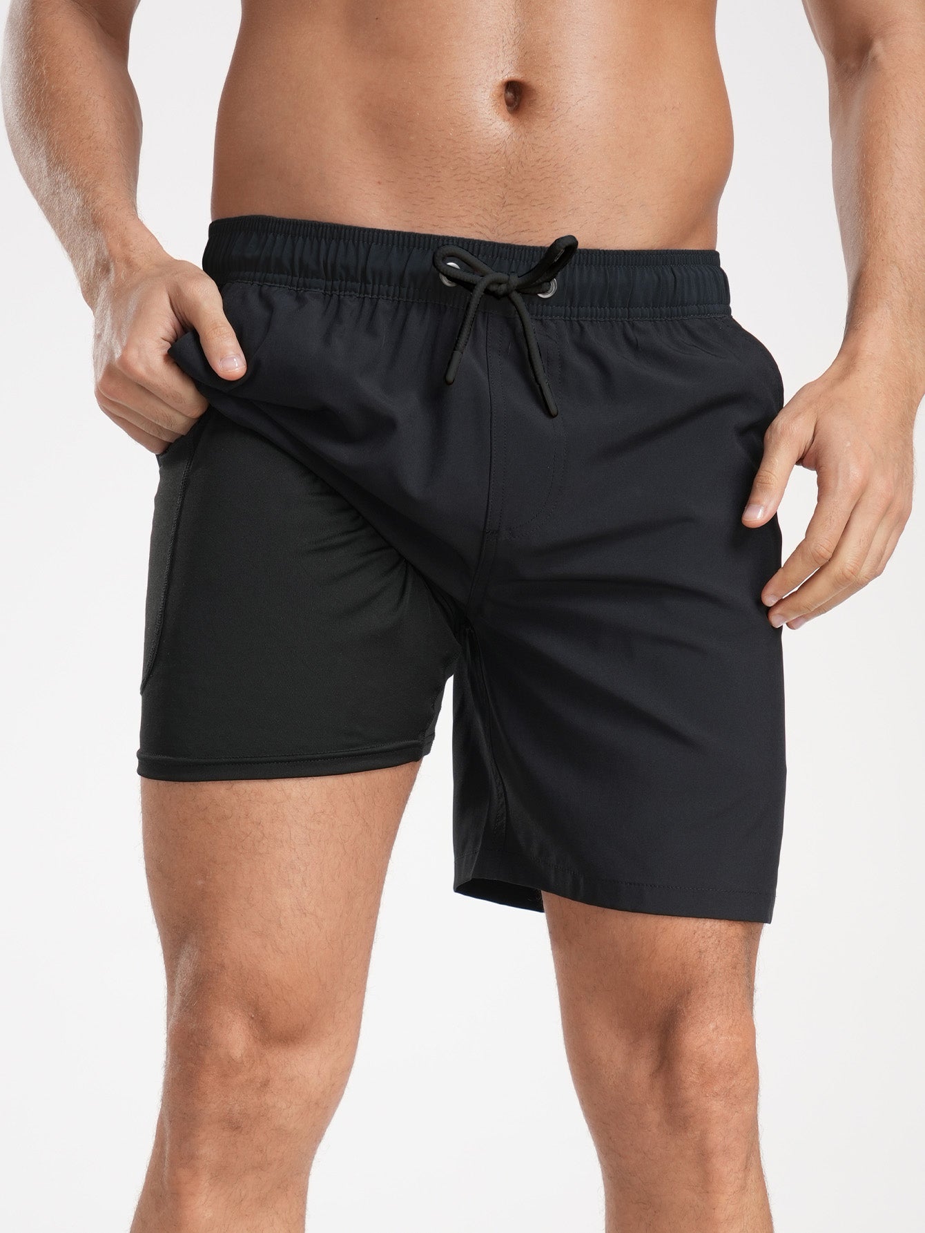 2 En 1 Sólido Color Pantalones Cortos de Baño con Cuerda