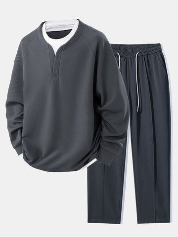 Raglan Sleeve 2 In 1 Waffle T-Shirt & Single Pleat Drawstring Straight Leg Pants