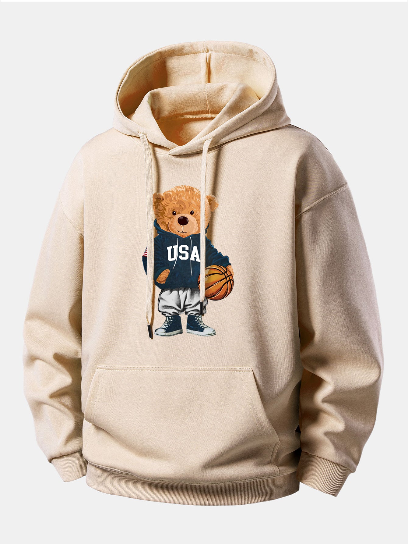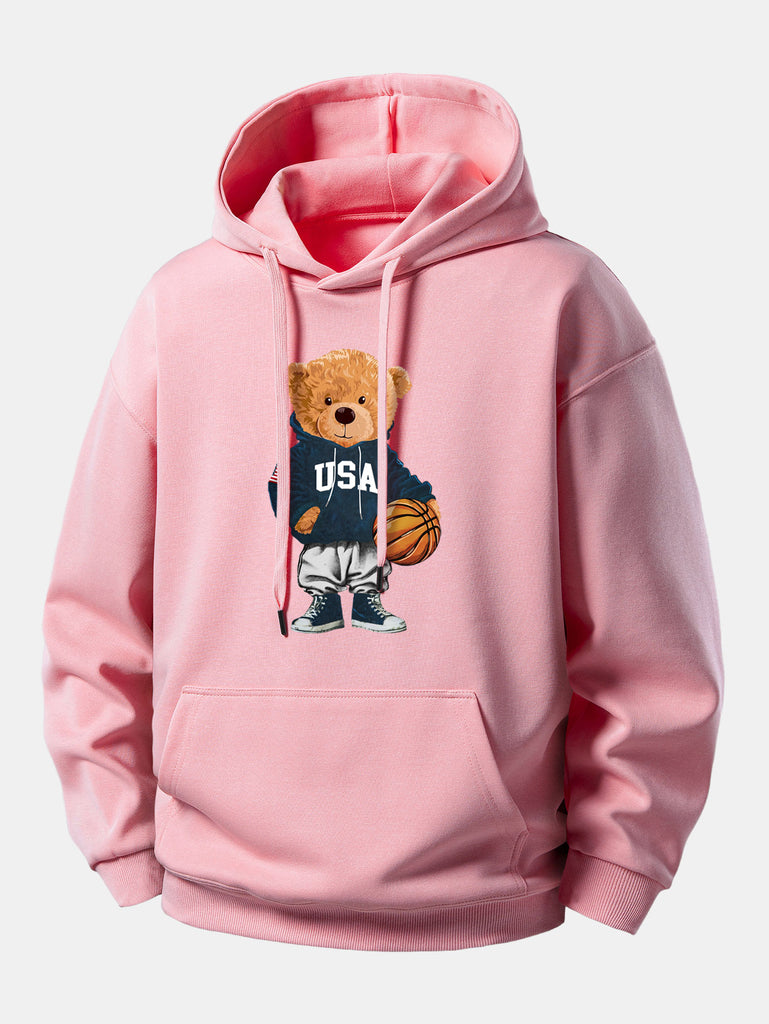 Basketball Bear Print Relax Fit Drawstring Hoodie